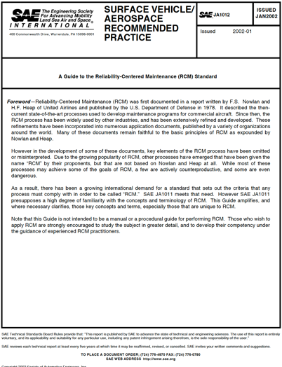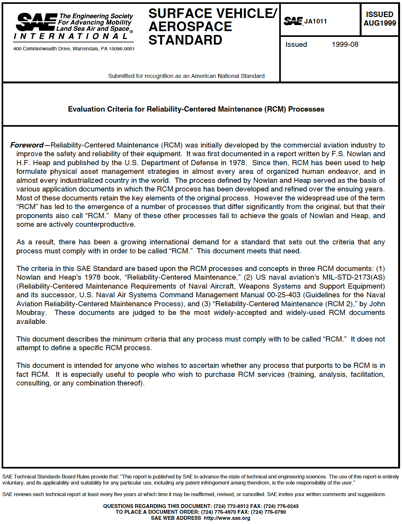 SAE JA1012 amplifies and clarifies each of the key criteria listed in SAE JA1011 and summarizes additional issues that must be addressed in order to apply RCM successfully.